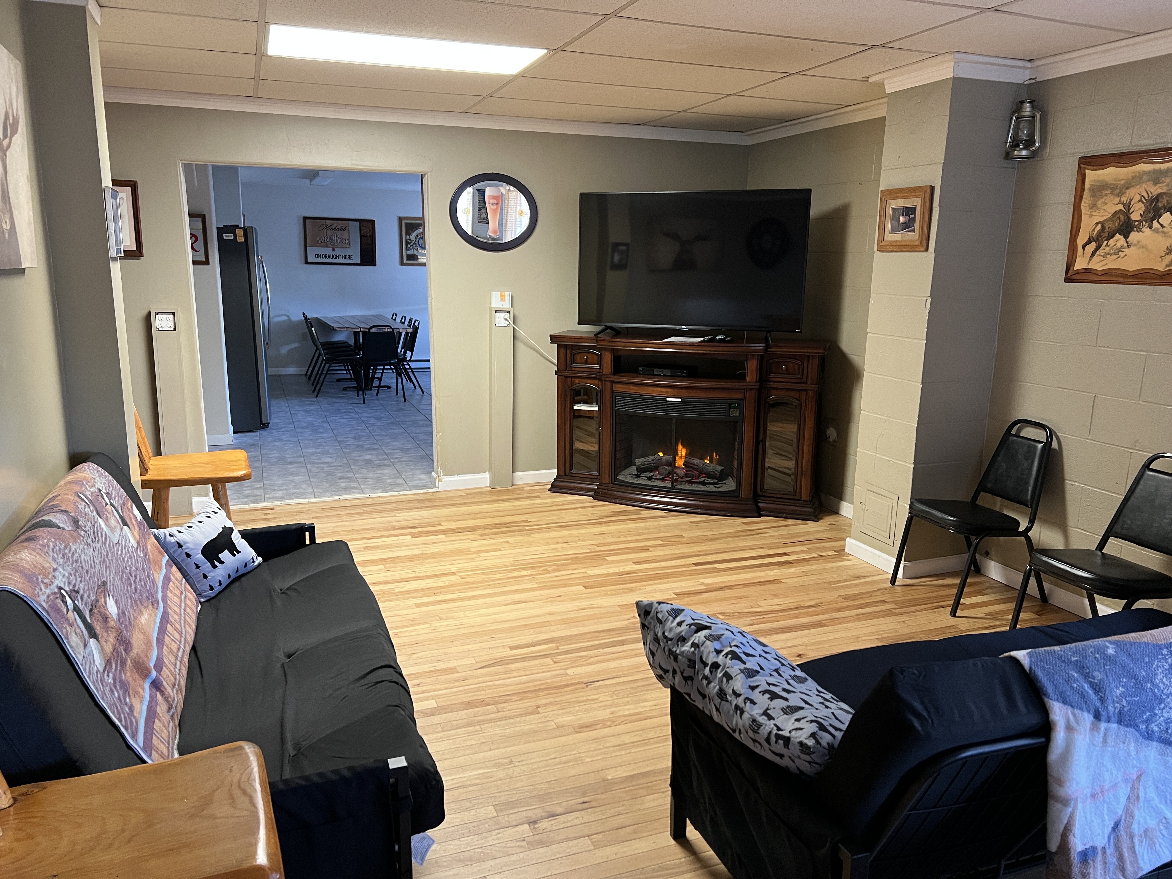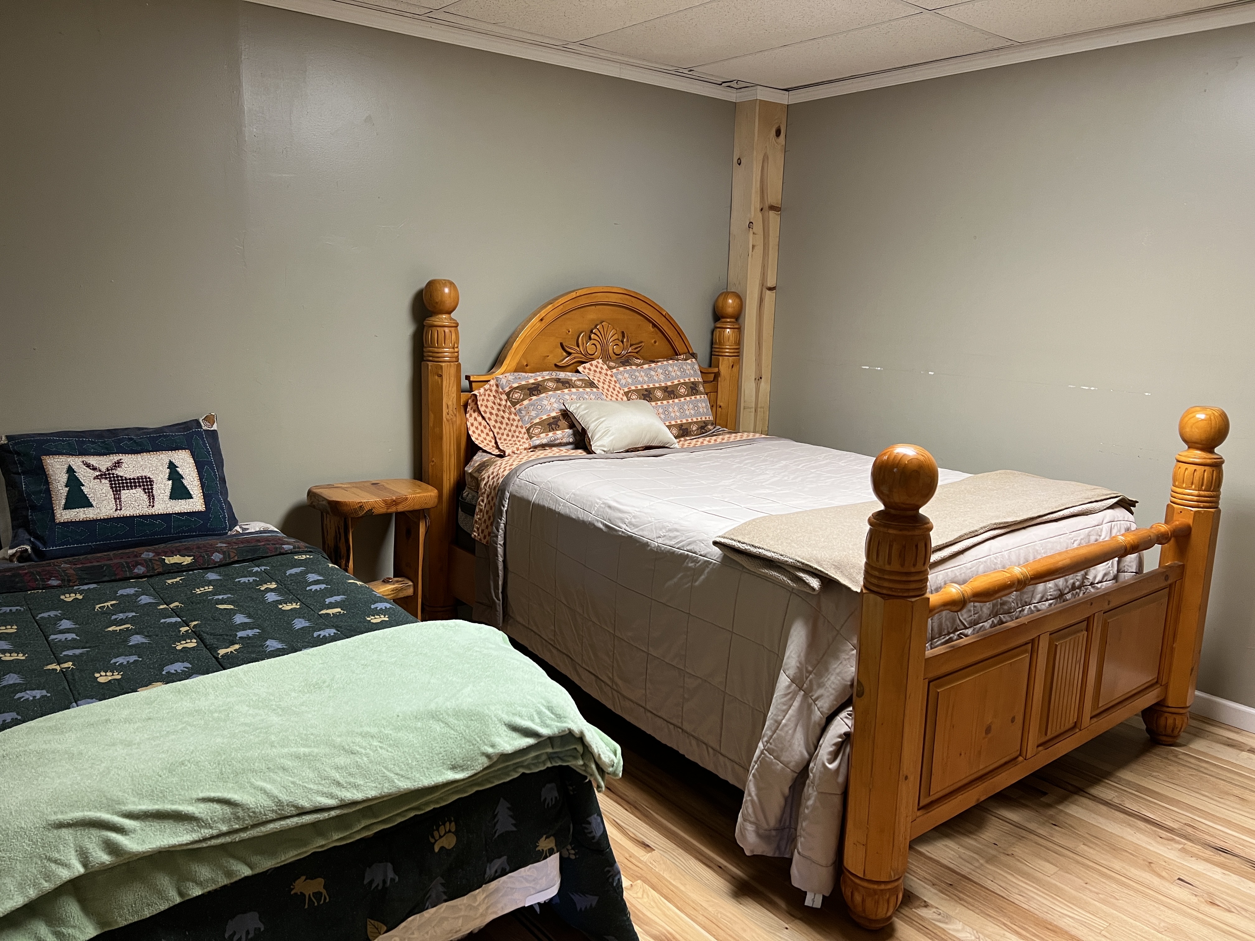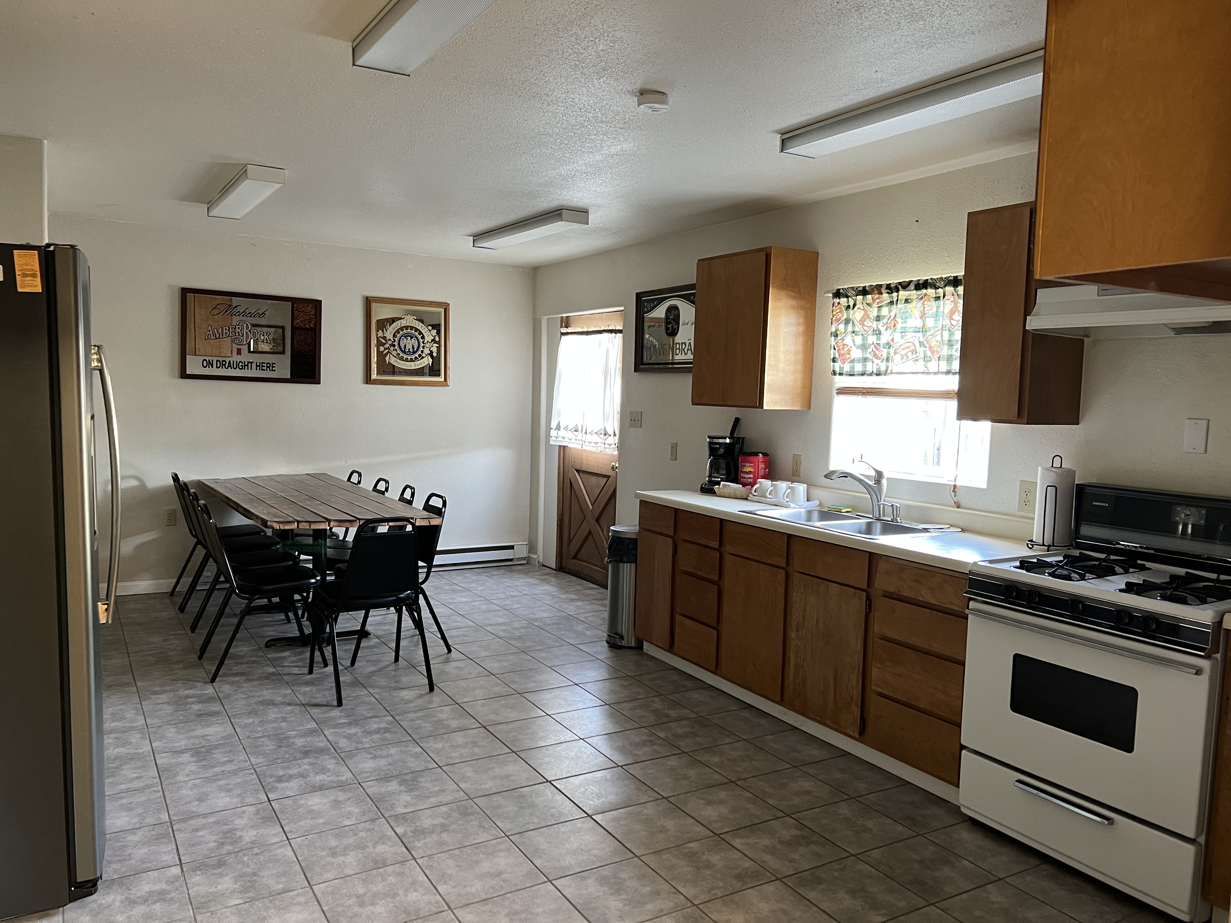 Need a place for larger gatherings? Check out our newest addition to the Pioneer Inn, THE BUNKHOUSE! Equipped with 2 bedrooms, each with a queen bed as well as a twin. Two additional queen beds located off of the living room. The living room is equipped with a large sectional couch, a fireplace, and a 65 inch Smart TV. Walk into the kitchen to find all of the amenities, as well as a large kitchen table to seat everyone! Call us for pricing!