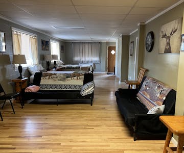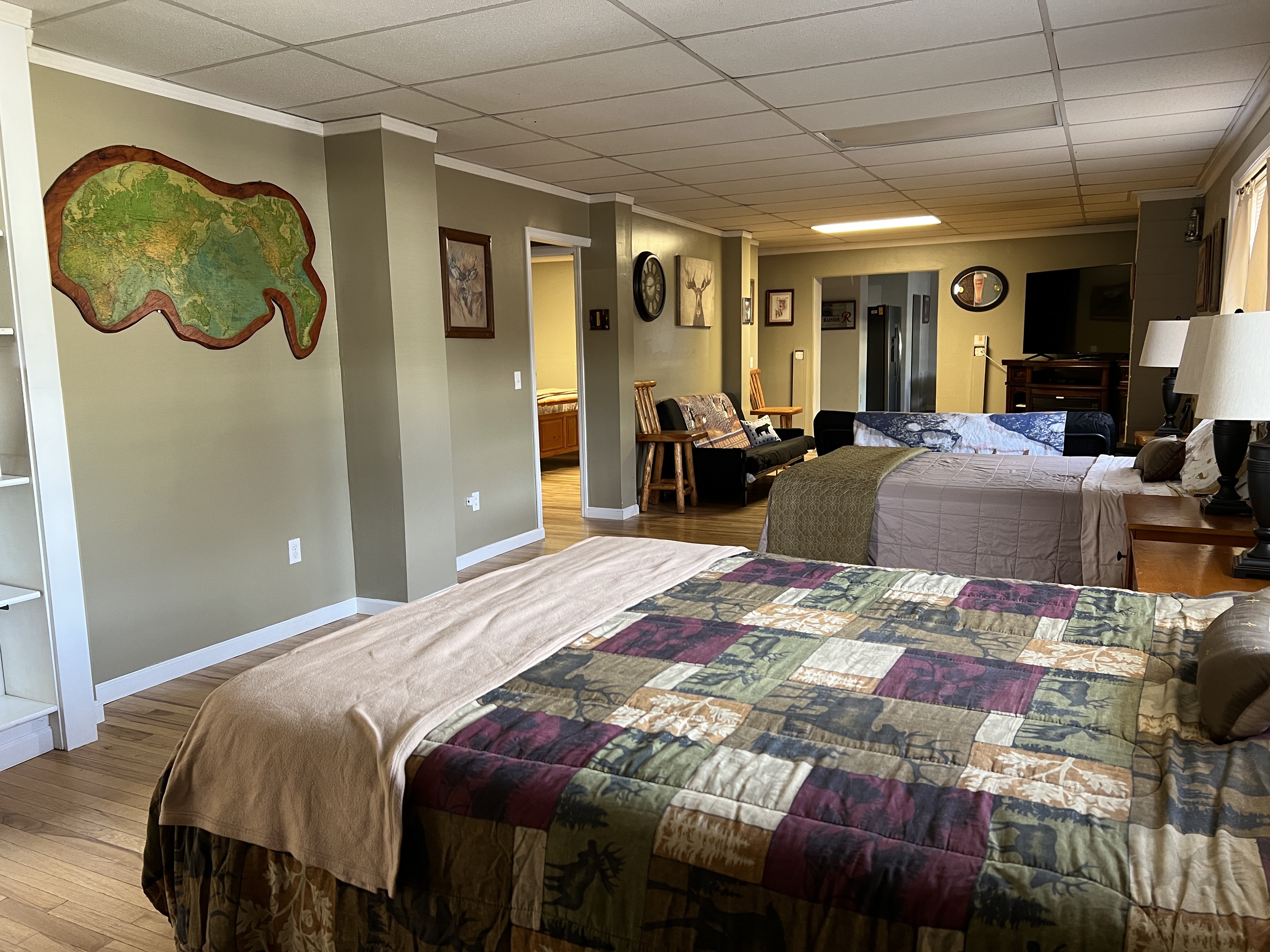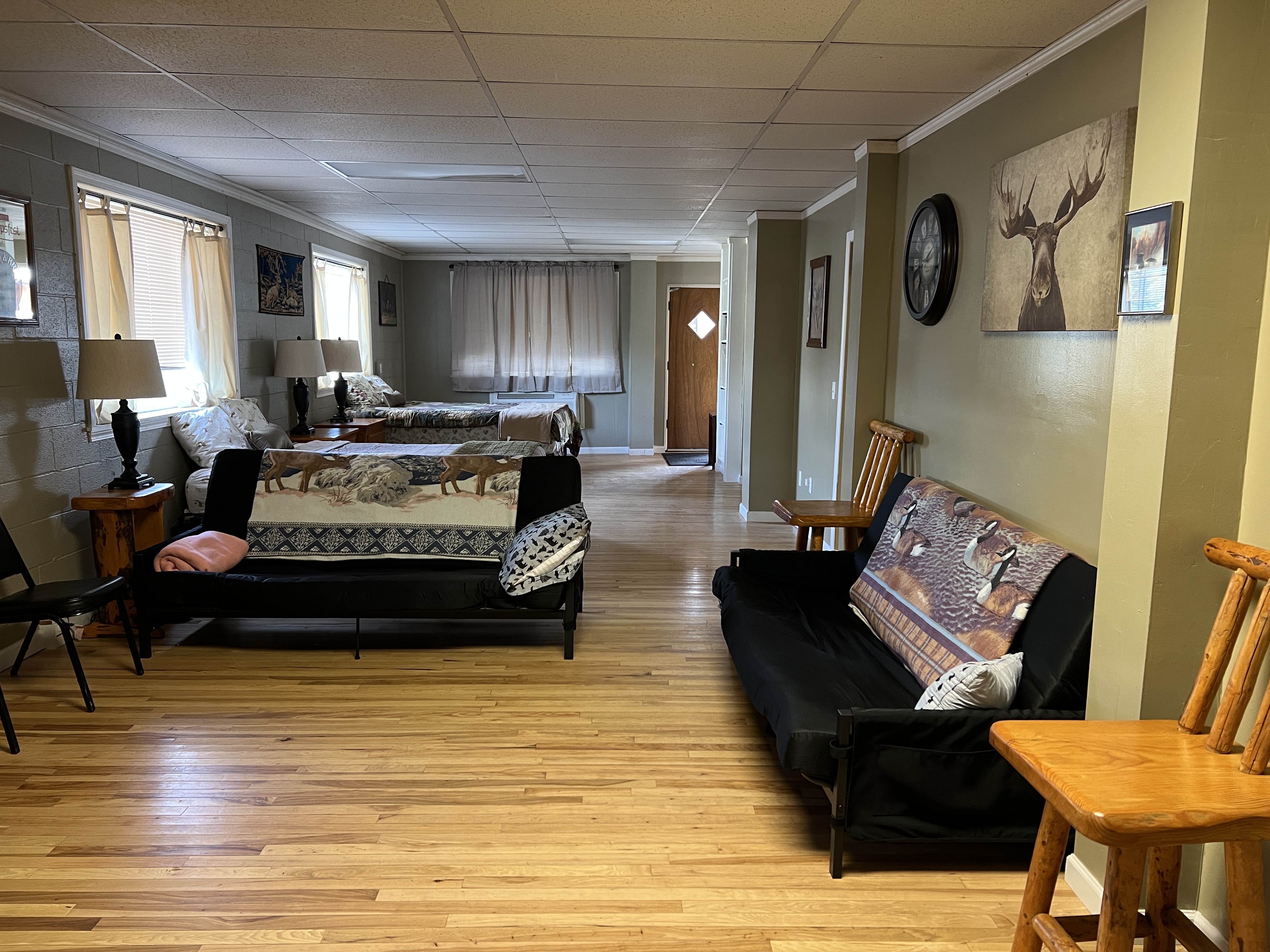 Need a place for larger gatherings? Check out our newest addition to the Pioneer Inn, THE BUNKHOUSE! Equipped with 2 bedrooms, each with a queen bed as well as a twin. Two additional queen beds located off of the living room. The living room is equipped with a large sectional couch, a fireplace, and a 65 inch Smart TV. Walk into the kitchen to find all of the amenities, as well as a large kitchen table to seat everyone! Call us for pricing!